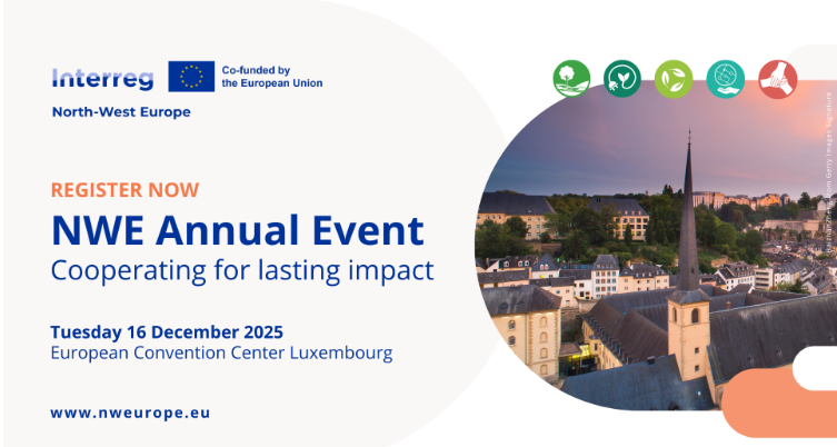 Het Interreg Noordwest-Europa-programma is verheugd aan te kondigen dat zijn volgende transnationale jaarlijkse evenement op dinsdag 16 december zal plaatsvinden in het European Convention Center Luxembourg. Dit eendaagse evenement zal de aandacht vestigen op NWE-projecten die momenteel een verschil maken in Noordwest-Europa en unieke mogelijkheden bieden om te netwerken rond belangrijke thema’s die in ons programma aan bod komen.